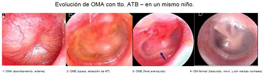 Los signos más fiables de la OMA (otoscopia) son alteraciones en la movilidad (otoscopia neumática), opacidad y abombamiento de la membrana timpánica (MT), burbujas, o nivel hidro-aereo.  Estos serian los signos de efusión. Efusión es cualquier tipo de fluido en la caja del oído medio, pus, moco, sangre, liquido mucoide etc.