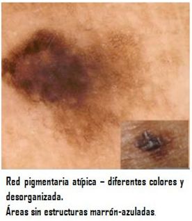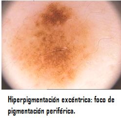 Diagnostico diferencial: Se deben diferencIar de los nevos melanocíticos con focos excéntricos de hiperpigmentación (foto), descrito en 1994 por Bolognia et al. como 'pequeños puntos oscuros,' puede ser considerado como un tipo de lesión símil-melanoma, de nevus melanocíticos adquiridos.