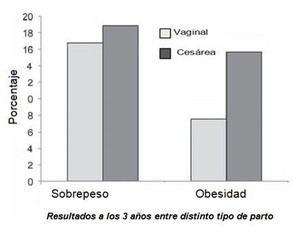 Los niños nacidos por cesárea tienen dos veces más probabilidad probabilidades  de obesidad infantil, comparado con los partos vaginales, incluso después de ajustar por índice de masa corporal materna, peso al nacer y otras variables de confusión.