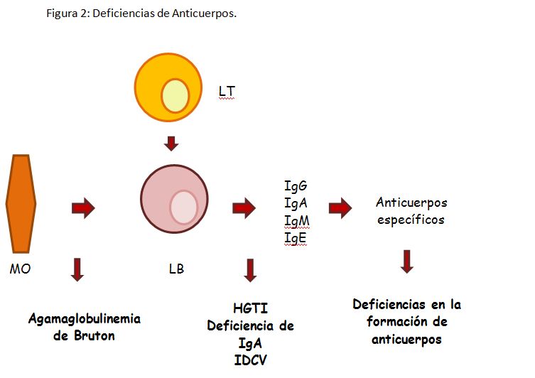 DEFICIENCIAS HUMORALES: Las deficiencias  humorales o de anticuerpos son las IDP más frecuentes (50-70%).  Son aquellas que afectan la síntesis o el funcionamiento de los anticuerpos (inmunoglobulinas) (FIG 2). En condiciones normales, la MO prodluce Linfocitos B (LB) que circulan por sangre periférica y habitan los ganglios linfáticos.