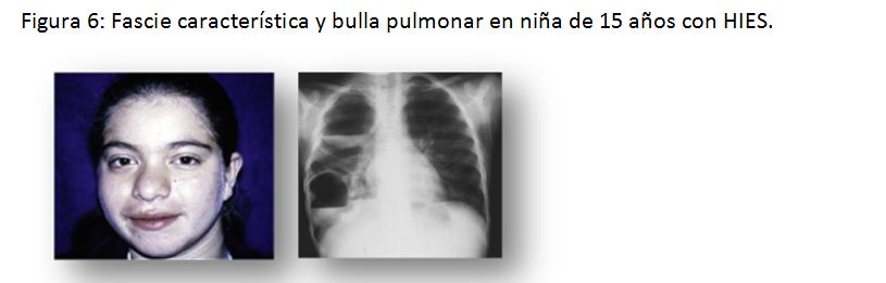 Síndrome de Híper IgE (HIES): este complejo síndrome tiene múltiples características distintivas que van apareciendo a medida que el paciente crece. Las principales son: FASCIE PECULIAR, defecto del colágeno que lleva a FRACTURAS PATOLÓGICAS y formación de  BULLAS pulmonares permanentes, DIENTES SUPERNUMERARIOS por falla en la caída de los dientes primarios, defectos de LÍNEA MEDIA (paladar alto, escoliosis) e INMUNODEFICIENCIA con clara predisposición a infecciones por S. aureus (abscesos cutáneos, neumonía), micobacterias y ciertos hongos (cándida, Aspergillus).