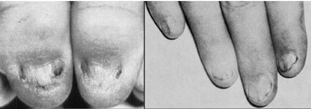 ……Las uñas eran estrechas y hundidas……Uñas hiperconvexas y/o displásicas. Uñas hiperconvexas, estrechas y raíz deprimida 70%.