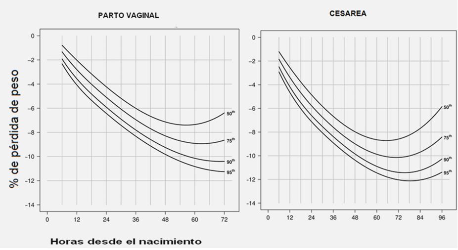 Con nomogramas que muestran por separado los recién nacidos por vía vaginal y por cesárea, es evidente que la pérdida de peso diferencial por parto, se materializó temprano y persistió en el tiempo. Los factores que contribuyen a la dificultad para la lactancia han sido bien documentados entre los sometidos a cesárea.