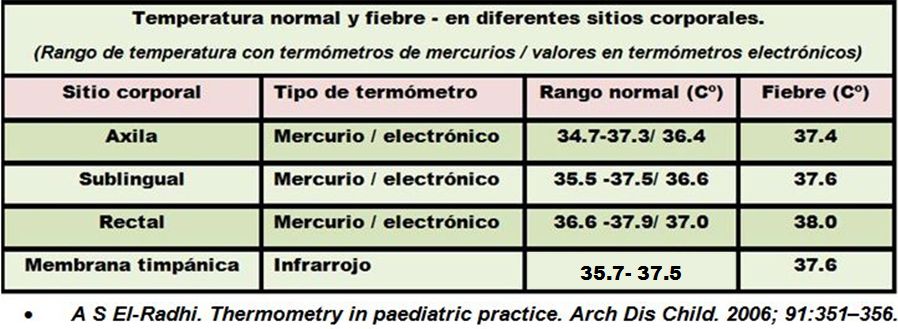 En una muy buena revista británica de pediatría, donde se hace una revisión sobre la termometría en la práctica pediátrica, se publica la siguiente tabla, con los rangos de la temperatura tomada en diferentes sitios.