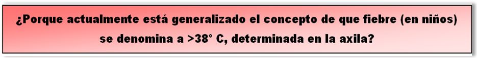 Ambos estudios, uno más viejo (1998), y el otro más reciente (2006), coinciden en que el límite para considerar como febril a un paciente es de > 37.4°C en la axila, y > 38.0 - 38.2 en el recto. Entonces el concepto de, fiebre es mas de 38°, se deber referir a la temperatura rectal.
