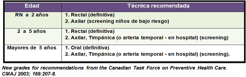 La temperatura axilar es recomendable en situaciones de poco riesgo, o como screening, a toda edad.
