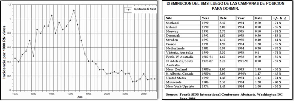 En la década siguiente, la incidencia de muerte súbita en los Estados Unidos disminuyó sorprendentemente en un 53%. Desde entonces, la tasa de muerte súbita se ha mantenido estable, mientras que las tasas de mortalidad infantil en general de Estados Unidos han disminuido ligeramente. Cada año en los Estados Unidos, 4.500 muertes se clasifican como de muerte súbita infantil inesperada (SUDI). Esto incluye las muertes por SMSI o asfixia durante el sueño, y muertes en las que no existía suficiente información para clasificar la causa. Aproximadamente 2.500 de estas muertes son causadas por SMSI. Hay una marcada disparidad en la incidencia de muerte súbita entre razas y grupos étnicos, estas diferencias se correlacionan con las distintas prácticas culturales en la posición para dormir de los lactantes.