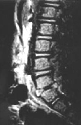 El diagnóstico más probable es discitis L5-S1. Las imágenes por resonancia magnética de la columna, muestra abombamiento tanto anterior y posterior del disco L5-S1, con  erosión de los bordes anteriores, tanto de las vértebras L5 y S1. Existe también evidencia de edema dentro de los cuerpos vertebrales. Las apariciones radiológicas tienen más probabilidades de ser compatible con una discitis suave.