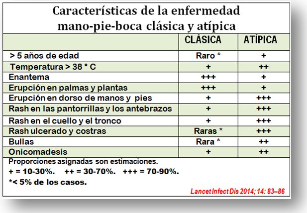 El cuadro atípico mano, pie y boca es causado por un virus Coxsackie A6 y se caracteriza por fiebre alta y erupciones versículo ampollosas en las pantorrillas y dorso de las manos.  En general se encuentra el antecedente de exposición a enfermos con un exantema similar, en los 7-10 días anteriores al comienzo del cuadro.