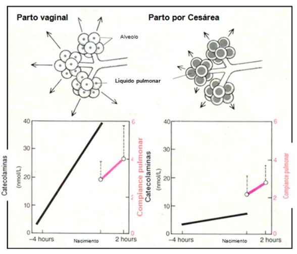 Niveles de catecolaminas y compliance pulmonar luego de un parto vaginal vs. nacimiento por Cesárea.