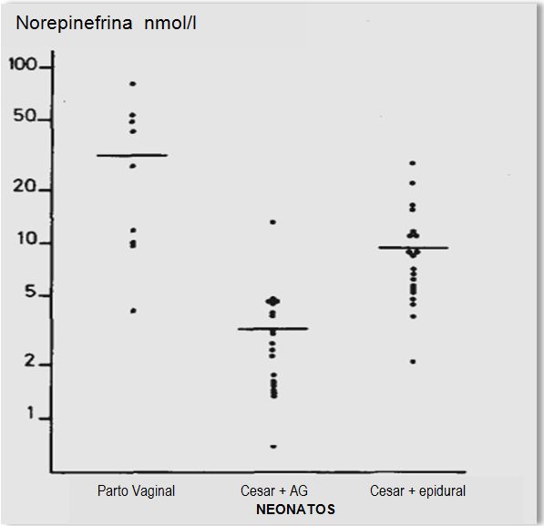 Los niveles de catecolaminas en el plasma fetal y materno, se midieron al nacer en 40 mujeres con embarazos normales a término que se sometieron a cesárea electiva; 20 mujeres bajo anestesia general, y 20 bajo anestesia epidural. Para la comparación, las mismas medidas también se hicieron en 10 mujeres que se sometieron a parto vaginal sin signos de estrés fetal intraparto. Los bebes nacidos por vía vaginal mostraron una marcada mayor activación simpático-adrenal (norepinefrina y epinefrina) que los nacidos por cesárea electiva. En este último grupo, sin embargo, se encontró que el tipo de anestesia materna influyó en la activación simpático-adrenal fetal, ya que los niveles neonatales de catecolaminas fueron mayores en el grupo de anestesia epidural, que en el grupo de anestesia general (gráfico). Un factor responsable de desencadenar la liberación de catecolaminas durante el parto vaginal podría ser el trauma mecánico del feto, particularmente la cabeza, al pasar por el canal del parto.
