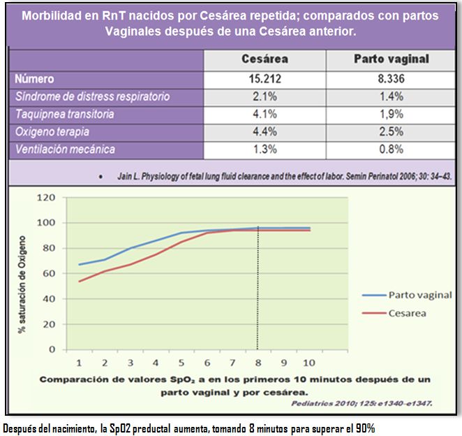Un escenario clínico frecuente es aquel donde el líquido pulmonar retenido contribuye a la mala adaptación respiratoria en el parto operatorio de un RN que no tuvo trabajo de parto. Estos neonatos no aumentan su saturación de oxígeno tan rápidamente como los recién nacidos a término, y muestran una incidencia aumentada de taquipnea transitoria del recién nacido y otras morbilidades respiratorias.