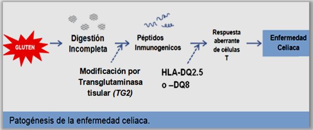 Un evento patogénico clave en la enfermedad celiaca, es el destinado contra los fragmentos de gluten. Estos fragmentos antigénicos son capaces de activar a las células inmunes en el intestino, reclutar células T infltrantes e iniciar eventos de señalización proinflamatoria que, con el tiempo, provocan la remodelación profunda de los tejidos intestinales.