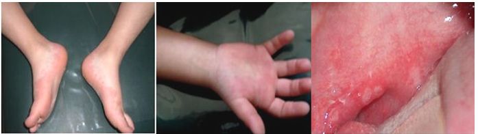 Petequias y erosiones de la mucosa son frecuentes y pueden sumarse síntomas sistémicos como malestar general, artralgias y fiebre de bajo grado. El exantema papulo-purpúrico en  'Guantes y calcetines', en general respeta la cara, excepto la zona peribucal.