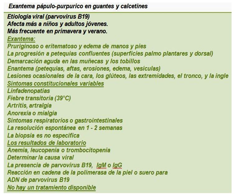 Este es un raro exantema, autolimitado caracterizado por lesiones purpúricas eritemato-papular y llamativamente marginado las manos y los pies, en distribución de  'guantes y calcetines',  inestable y a  menudo refieren prurito y en ocasiones dolorosos.