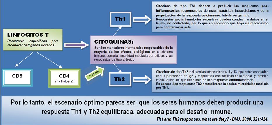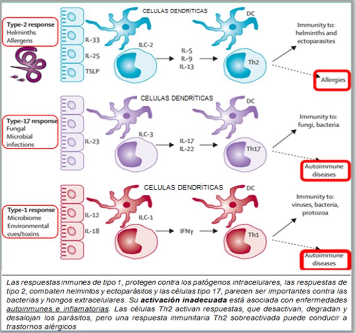 Las respuestas inmunes de tipo 1, protegen contra los patógenos intracelulares, las respuestas de tipo 2, combaten helmintos/ ectoparásitos, y las células tipo 17, parecen ser importantes contra las bacterias y hongos extracelulares.