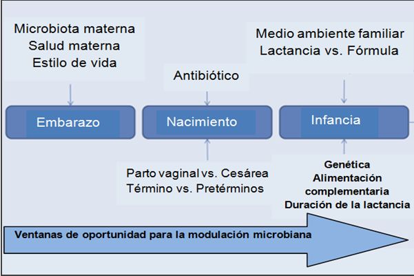 Por lo tanto, es el período post-natal, donde se genera y estabiliza la microbiota intestinal, y  este sistema está suficientemente armonizado, para ejercer una gran influencia sobre el organismo en desarrollo. El canal de parto normal expone al niño a un microbioma diferente al encontrado durante un parto por cesárea en un quirófano, lo que da lugar a diferencias en el microbioma del recién nacido, a medida que estos colonizadores tempranos son fácilmente reemplazados por especies adquiridas externamente, a medida que la diversidad de la microbiota infantil aumenta con el tiempo - Al nacer, el intestino está libre de gérmenes, pero rápidamente entra en un extenso y complejo proceso de colonización por una variedad de microbios.