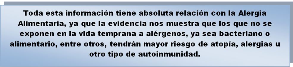 La microbiota intestinal, podría definirse como los trillones de microbios que habitan colectivamente en la luz intestinal,  una evidencia creciente muestra que los patrones alterados de la exposición microbiana (disbiosis) temprano en la vida, pueden conducir al desarrollo de AA al influir negativamente en el desarrollo del sistema inmune. Por lo tanto, la microbiota intestinal podría considerarse un objetivo potencial para la intervención preventiva y terapéutica contra las alergias alimentarias.