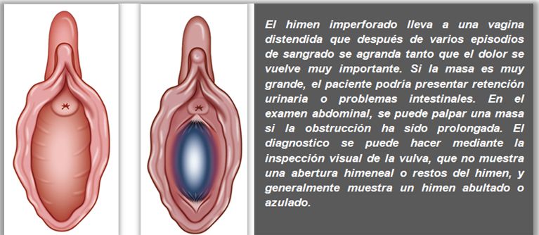 La sospecha de himen imperforado debe tenerse en cuenta en una niña puber, pero sin menarca, que consulta por dolor abdominal o lumbar periódico. En estos casos, se debe realizar un examen ginecológico externo.