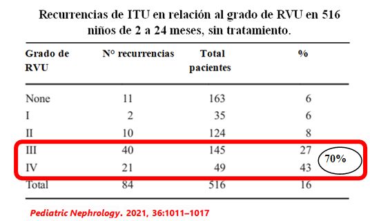 El RVU de alto grado afecta solo al 10% de los bebés con una primera ITU febril, el 90% comprendían resultados normales y grado I-II, la aplicación universal de estas recomendaciones a todos los grupos de edad conduciría a muchas investigaciones innecesarias.