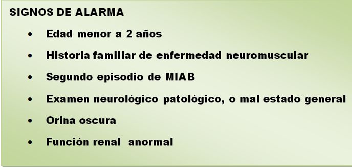 En pacientes con al menos 1 signo de alarma, se deben realizar exámenes de diagnóstico adicionales, de acuerdo con el historial y el cuadro clínico específico del paciente (es decir, ácidos orgánicos urinarios, pruebas moleculares, estudio neurofisiológico). En ausencia de un método probado para predecir el riesgo de insuficiencia renal aguda, proponen que los pacientes con síntomas leves, tira reactiva de orina normal y niveles séricos de CK inferiores a 10 veces los valores normales deben considerarse pacientes de bajo riesgo. Pueden ser dados de alta del servicio de urgencias y tratados como pacientes ambulatorios con hidratación oral, analgésicos y reposo. Sin embargo, se recomienda un seguimiento clínico y de laboratorio dentro de los 10 a 15 días para confirmar el diagnóstico y el pronóstico benigno.