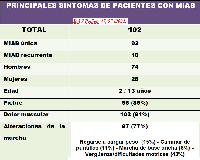 La miositis infantil aguda benigna (MIAB) es un síndrome autolimitado asociado con infecciones virales que se caracteriza por dolor simétrico en las extremidades inferiores que generalmente afecta a niños en edad escolar. Raramente se reporta evolución en rabdomiólisis y daño renal. El principal agente causal es el virus de la gripe A o B, aunque se han descrito otros agentes, como enterovirus y Mycoplasma.
