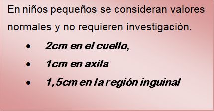 En niños pequeños, 2 cm en el cuello, 1 cm en la axila y 1,5 cm en la región inguinal se consideran valores normales y no requieren investigación