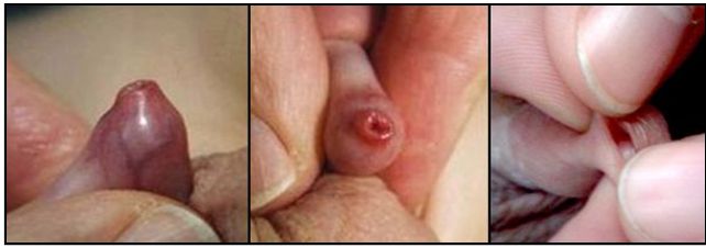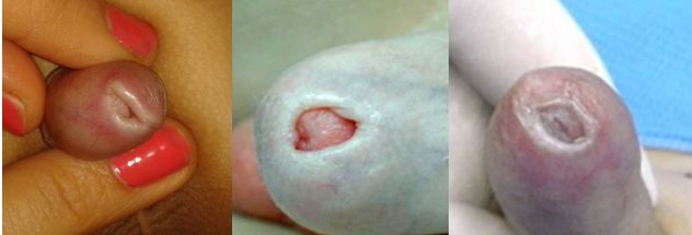 El orificio prepucial en la fimosis puede variar, pero aquellos que parecen puntiformes, al realizar la tracción (foto) hacia arriba del prepucio - como si fuera una manga -  muestra un orificio realmente más amplio de lo que impresiona, sin ejecutar esta maniobra.