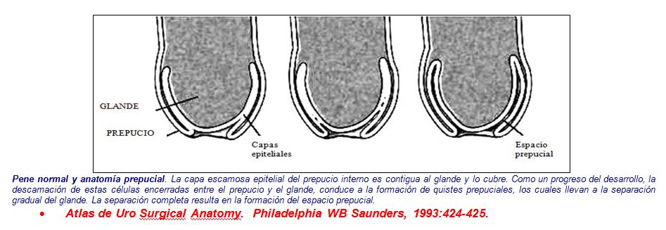 La superficie interna del prepucio, y la superficie del glande están recubiertas por un epitelio común, que se separa más o menos al momento del nacimiento, o más adelante, posiblemente mucho más tarde (Deibert, 1933; Gairdner, 1949). Este epitelio común se denomina erróneamente '' adherencias' y, del mismo modo, la separación se denomina, también, por desgracia '' resolución de adherencias'