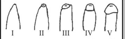 Tipo V: con exposición fácil de todo el glande, con inclusión del surco balanoprepucial, sin las adherencias que siempre se encuentran en todos los tipos anteriores, hasta donde es posible llevar el prepucio.