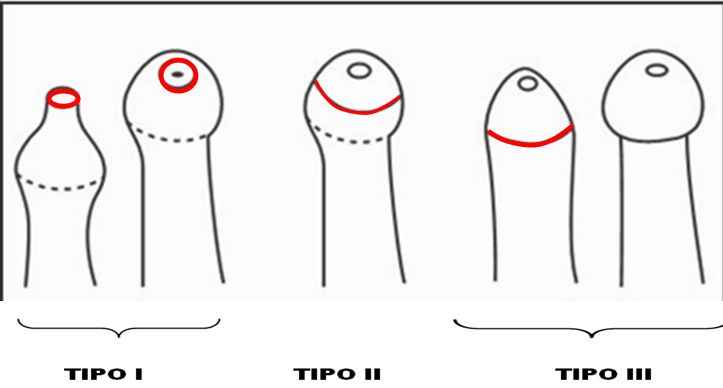 Tipo II: definido como la exposición del glande de aproximadamente la mitad del trayecto hasta el surco coronal.