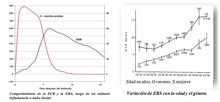 Aunque no es de interés pediátrico, se observó que después de la edad de 40 años y más en los varones, hay una elevación  de la ESR, cada vez mayor, especialmente después de la edad de 60 años (figura).  La PCR también se ve afectada por la edad, pero en mucho menor grado.