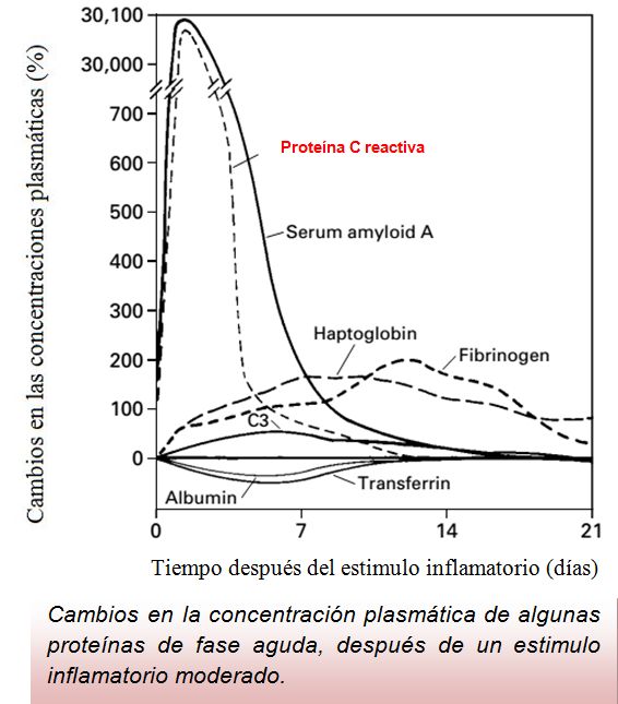 La proteína C-reactiva es una proteína de fase aguda, en particular la interleuquina-1 y 6  (IL-1-6), que aumenta 4-6 h después de un disparador inflamatorio, y hace su pico en 36 a 50 h. Los niveles disminuyen rápidamente con la resolución de la inflamación (figura). La PCR está generalmente muy elevada en las infecciones bacterianas invasivas, y se utiliza a menudo como un indicador de la inflamación.