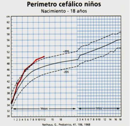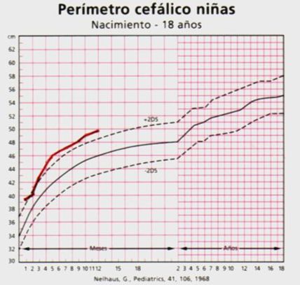 Se puede presentar con dos patrones de crecimiento del PC: los lactantes nacidos con un PC por debajo del P97 presentaron una velocidad de crecimiento acelerada y sobrepasaron de forma precoz las curvas de percentilos.
