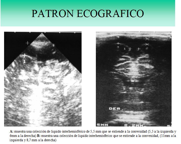 Descripción de la ecografía: una colección de líquido interhemisférico de 5,5 mm que se extiende a la convexidad (5,5 mm a la izquierda y 6 mm a la derecha) sin compromiso del sistema ventricular - fue comun a todos los pacientes, variando las mediciones.