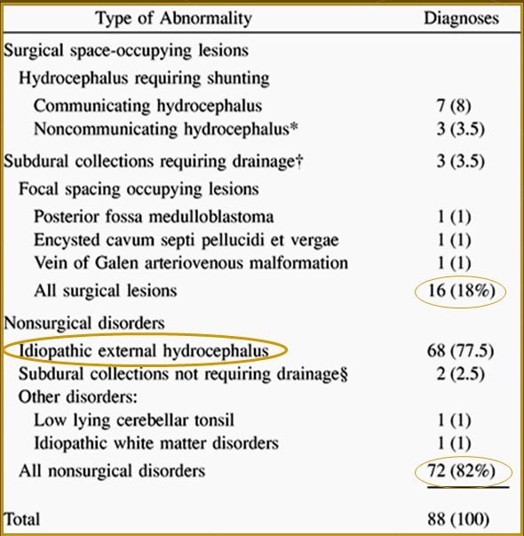 En una serie de 88 casos de macrocefalia, 68 fueron hidrocefalias externas benignas, dentro del grupo se incluian las lesiones quirurgicas y no quirurgicas.