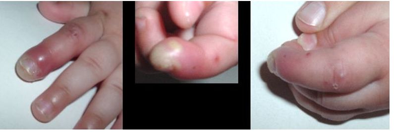 Este niño tiene un clásico panadizo causado por inoculación primaria del virus del herpes simple tipo I. En el interrogatorio surge, que la madre tiene herpes labial recurrente y que el último episodio lo superó varios días antes que su hijo desarrollara la lesión del dedo.