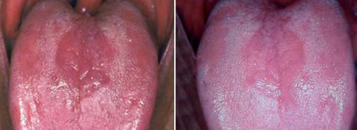 Algunos autores consideran a la lengua geográfica como una enfermedad inflamatoria de la mucosa, de etiología desconocida. Los hallazgos clínicos típicos son áreas bien circunscritas depapiladas rojas de la cara dorsal de la lengua, delineadas por un anillo elevado de color blanco-amarillo.