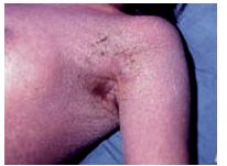 Una madre consulta por su hijo, un niño de 5 meses de edad, quién se presenta con pequeña zonas rojizas-marrones elevadas (nódulos) persistentes, prurito y lesiones secundarias de rascado. Dos meses antes había sido diagnosticada como sarna por un dermatólogo, y en consecuencia tratado con permetrina, y con esteroides para aliviar el prurito.