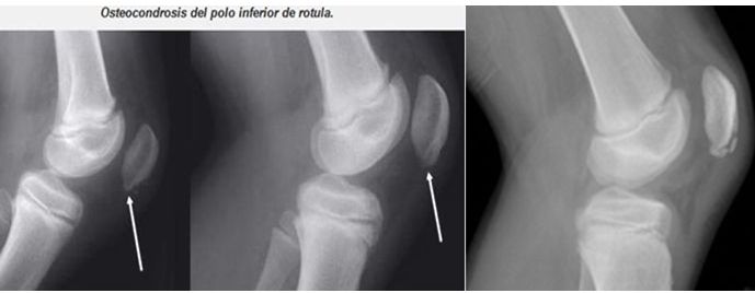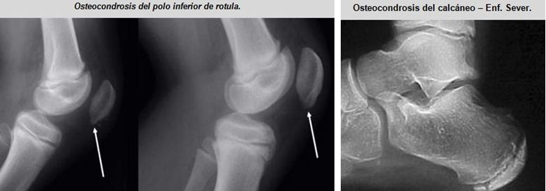 Alguna de ellas son: la enfermedad de Sinding-Larsen-Johansson, la enfermedad de Osgood-Schlatter, y la enfermedad de Sever; son osteocondrosis en las apófisis del poloinferior de la rótula, la tibia proximal, y el calcáneo, respectivamente.