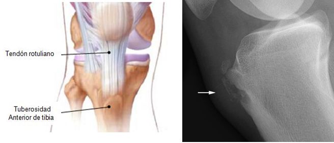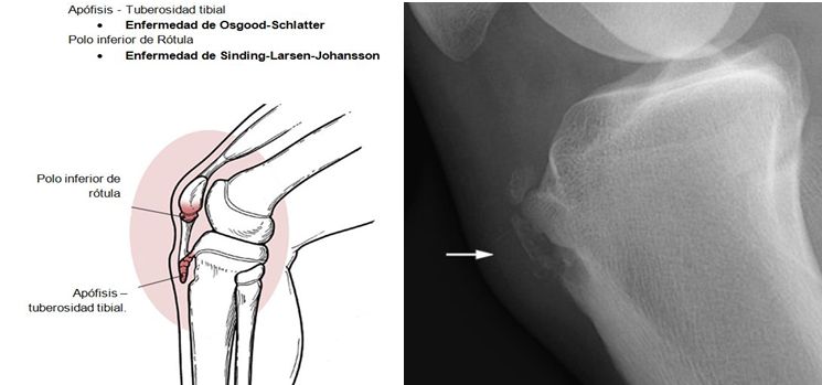 Es una entidad que produce dolor en la región anterior de la rodilla  (tuberosidad tibial), conocida como enfermedad de Osgood-Schlatter (EOS).  La condición, es un resultado de una tracción que ocurre en la tuberosidad tibial a causa del tirón del grupo muscular de los cuádriceps a través del tendón de la rótula.