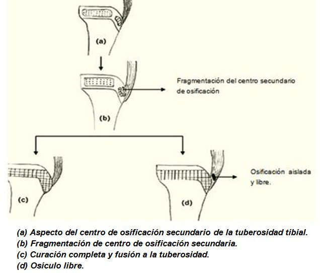 Una vez que el hueso o cartílago se  separa, sigue creciendo, y osificando  agrandándose. El área intermedia puede llegar a ser fibroso, la creación de una falta de unión localizada (huesecillo persistente separado), o puede mostrar la unión ósea completa con agrandamiento leve de la tuberosidad tibial.
