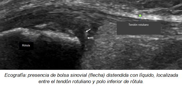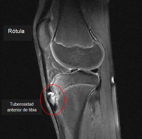 Hallazgos de la RM incluyen el engrosamiento y edema del tendón rotuliano distal, la bolsa infrarrotuliana distendida por fluido, el edema del tejido blando circundante, y edema de médula ósea subyacente a la tuberosidad tibial.
