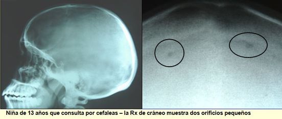 Al examen físico (datos positivos) se palpan dos depresiones de un centímetro de diámetro aproximadamente, en región parietal posterior, simétricas, no se evidencian lesiones del cuero cabelludo. La radiografía de cráneo muestra dos imágenes radiolúcidas circulares en región parietal, coincidentes con las depresiones que se palpaban.