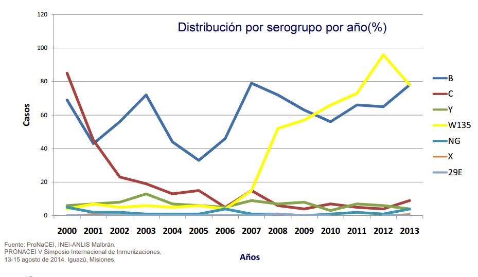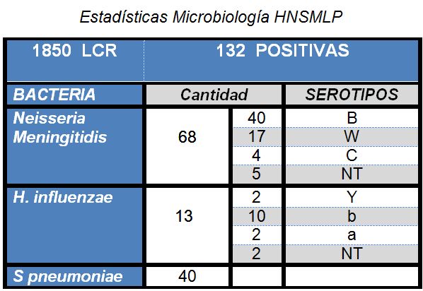 En estas estadísticas se observa que la Neisseria meningitidis B (Nme B) casi duplica a la suma de los otros meningococos, hallados en LCR de meningitis en niños de 0-14 años.