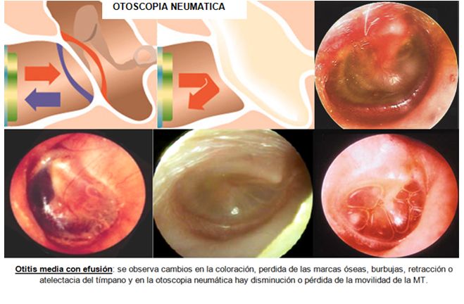 Los signos más fiables de la OMA (otoscopia) son alteraciones en la movilidad (otoscopia neumática), opacidad y abombamiento de la membrana timpánica (MT), burbujas, o nivel hidro-aereo.  Estos serian los signos de efusión. Efusión es cualquier tipo de fluido en la caja del oído medio, pus, moco, sangre, liquido mucoide etc.