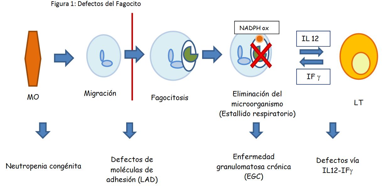 DEFICIENCIAS DE FAGOCITOS: Los fagocitos (neutrófilos y monocitos) son células pertenecientes a la inmunidad innata (El sistema inmunitario innato comprende las células y los mecanismos que defienden al huésped de la infección por otros organismos, de forma no específica), que se originan en la médula ósea (MO), circulan en sangre periférica, hasta que son “llamados” desde un sitio de infección, momento en el cual debe atravesar el endotelio vascular (migración) para lo cual requiere la integridad de las moléculas de adhesión leucocitaria (Las moléculas de adhesión celular (MAC) son proteínas transmembranales presentes en leucocitos y células endoteliales, la unión entre estas células por medio de las MAC es también conocida como adhesión celular). Una vez en el tejido infectado, fagocitan al microorganismo invasor y se ocupan de eliminarlo mediante 2 mecanismos fundamentales: el estallido respiratorio (a cargo de la enzima NADPH oxidasa) y la vía de IL12-IFγ, en la que colabora el linfocito T (LT), y que resulta indispensable en la inmunidad contra micobacterias. Existen defectos conocidos en cada uno de estos puntos de funcionamiento del sistema fagocítico que se traducen en una determinada IDP. (FIG 1) Este grupo representa alrededor del 10% de las IDPs, siendo la más frecuente la Enfermedad Granulomatosa Crónica, en la que la NADPH oxidasa es defectuosa, y el estallido respiratorio no se produce normalmente.
