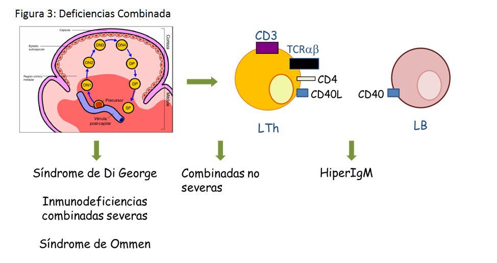 DEFICIENCIAS COMBINADAS: se denomina con este nombre a todas aquellas deficiencias que afectan al Linfocito T (LT), “actor principal” del sistema inmune, ya que cumple una función directa en la inmunidad contra gérmenes intracelulares y una función indirecta al colaborar con diferentes células del resto del sistema inmunológico. El LT tiene origen en el timo, donde es “educado” a para cumplir su función principal: diferenciar lo “propio” de lo “ajeno”. Aquellos que no lo logran, mueren en el timo, mientras que los LT competentes salen a sangre periférica, dotados de marcadores de superficie que los distinguen del resto de los Linfocitos (CD3, TCR: T- cell Receptor) Aquellos que expresan CD4 son los LT helpers, que colaboran con el resto del sistema inmunológico, principalmente con el LB en la producción de Inmjunoglobulinas IgG e IgA mediante la interacción molecular entre CD40L y CD40. (FIG. 3)