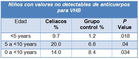 La respuesta a la vacuna contra el VHB se debe investigar en los niños con EC y un calendario de vacunación diferente pueden ser necesario. Por otra parte, la falta de respuesta a la vacuna contra el VHB puede considerarse como un signo de una posible enfermedad celíaca no diagnosticada.