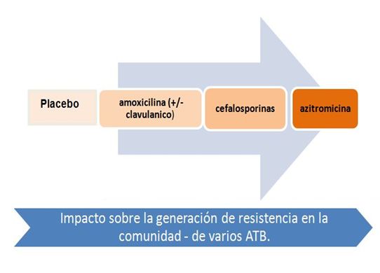 La droga que genera menor resistencia, para el S pneumoniae, es la Amoxicilina con o sin Ac. Clavulánico.  Mientras que las cefalosporinas orales y la azitromicinademuestran un potencial  de resistencia mayor en el individuo que la consume  y en la comunidad.